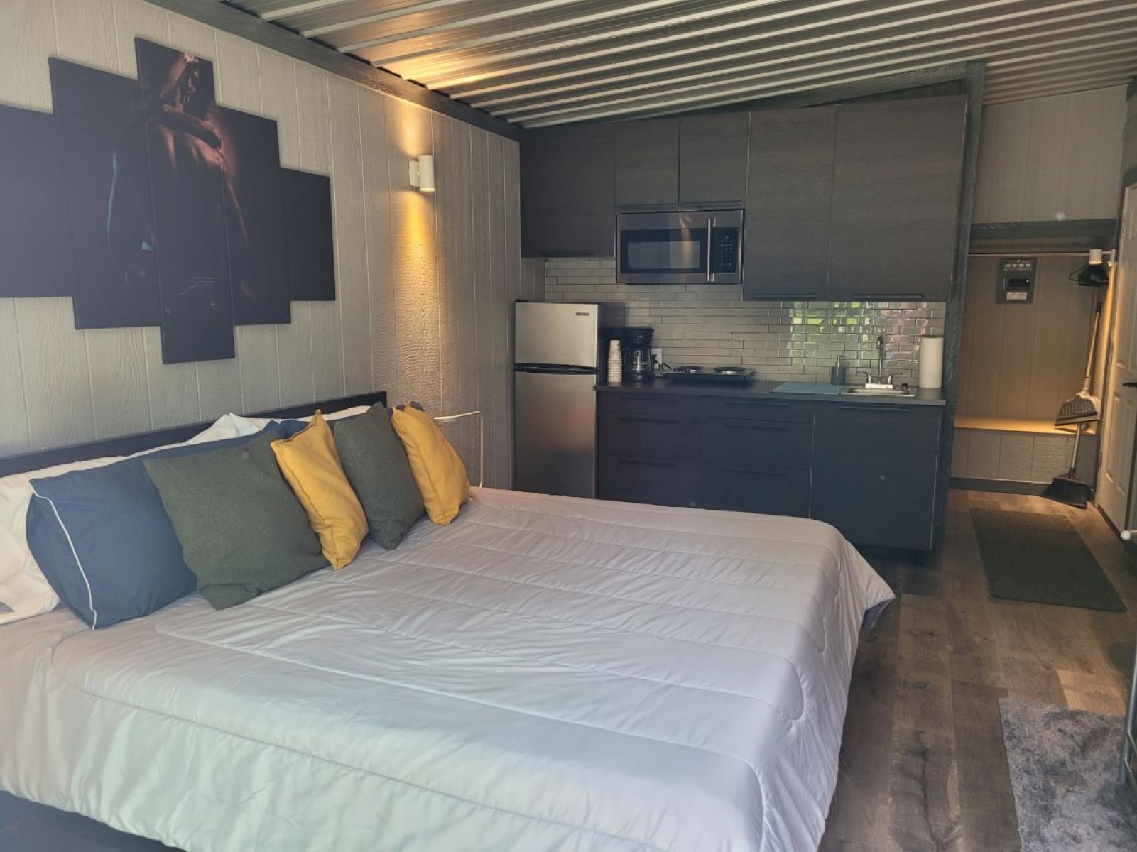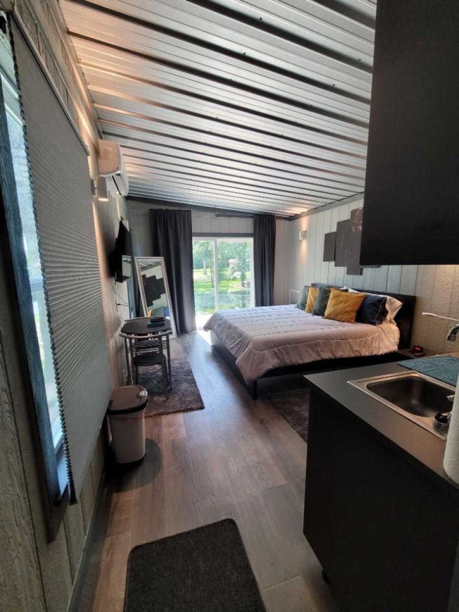 King Size Bed, TV, Internet, refrigerator, microwave, coffee pot, all linen and kitchenware.
