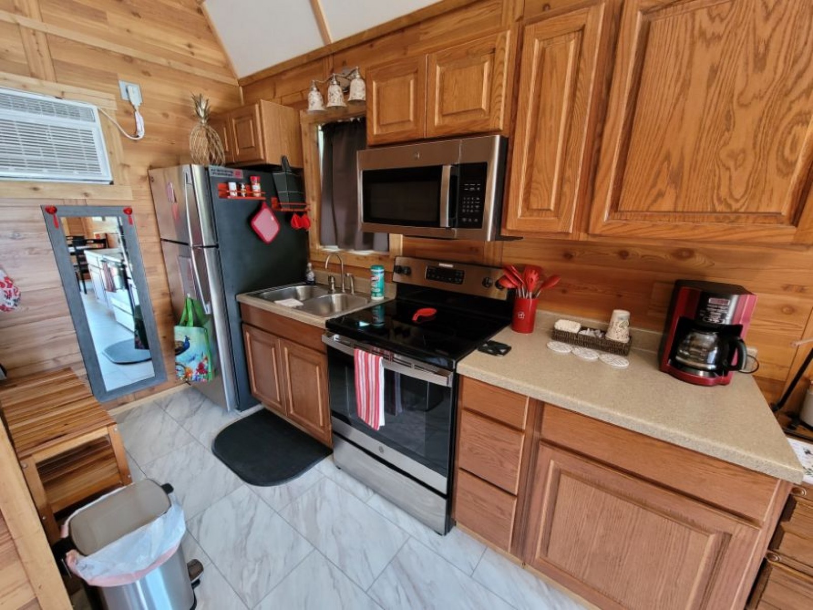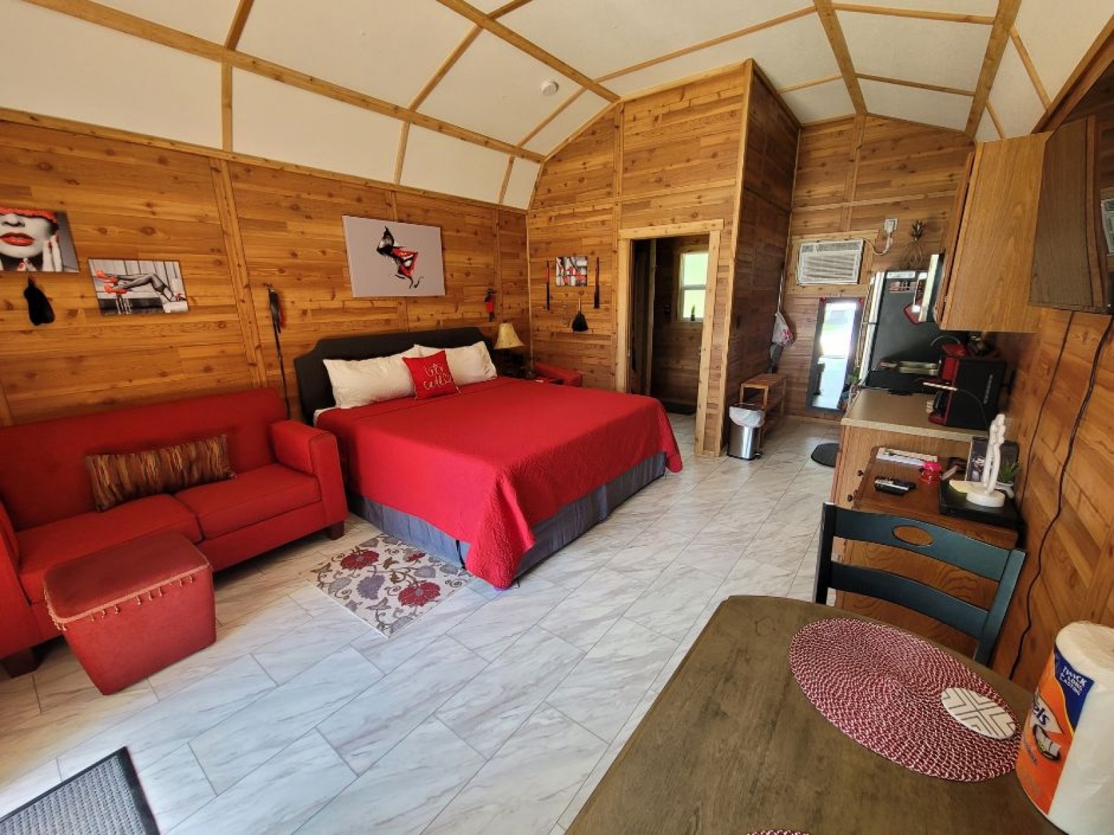 King Size Bed, TV, Internet, refrigerator, microwave, coffee pot, all linen and kitchenware.